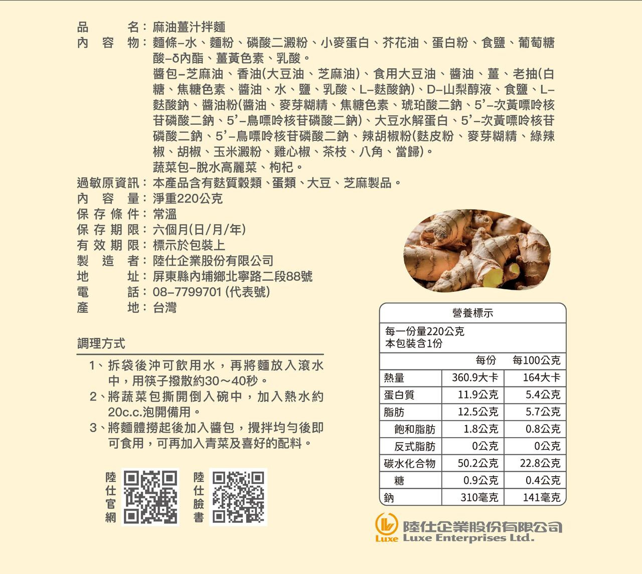 愛麵族|平安祈福拌麵-麻油薑汁 220g (蛋素) 30入/箱 [中華隊加油]限時優惠