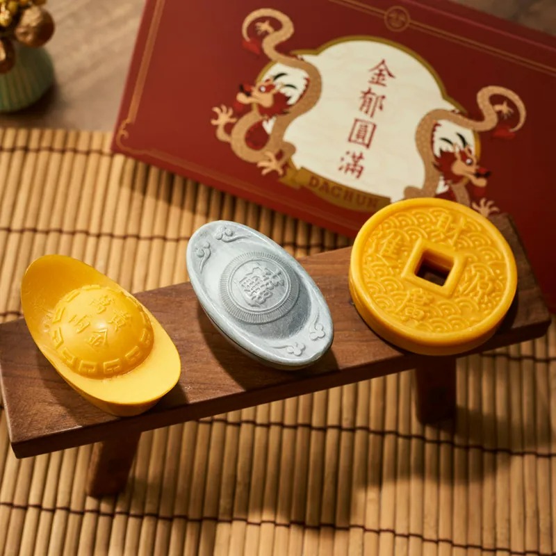 復刻古代銅錢造型,金黃皂體添加細緻珠光,壓印「財源廣進」字樣,帶有生活富足之祈願。「錢」字諧音「前」,錢成圓型,中間有孔,寓意為「眼前」,象徵富貴就在眼前。
